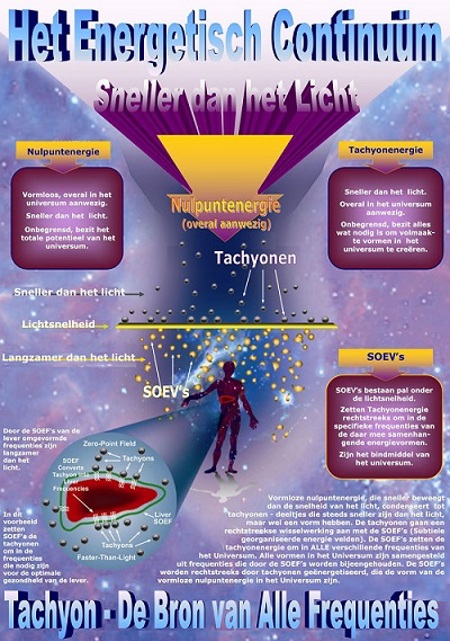 Zo werkt het min of meer ook met tachyonen. Ze zijn de onzichtbare potentie van materie en betrokken bij het ontstaan van elke organische vorm op aarde en in het heelal. Ze kunnen élke mogelijke frequentie aannemen. Bij de groei van een boterbloem neemt de tachyonenergie een andere frequentie aan dan bij de geboorte van een kalfje.