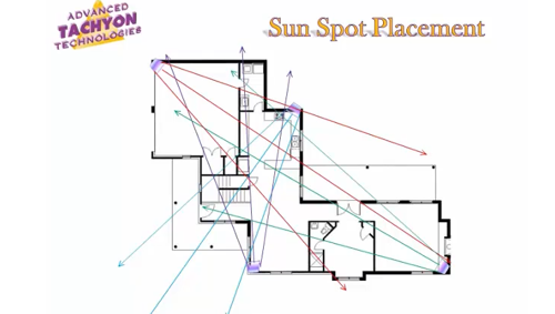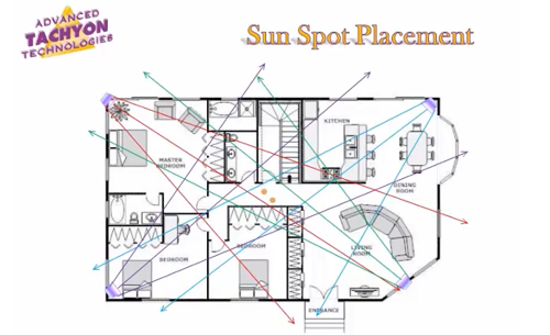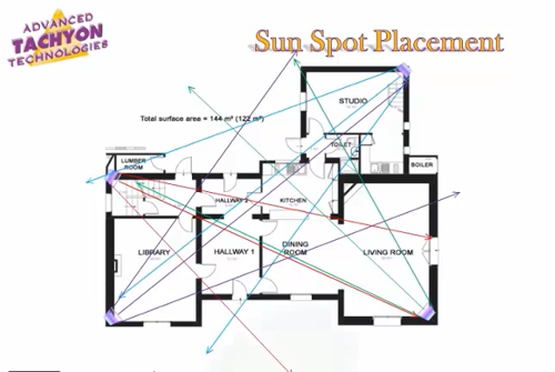 Plaats een sun spot in elk van de vier uiterste hoeken van de woning met de brede zijde naar de woning toe gericht en het smalste punt naar de muur toe gericht. Plaats ze exact zo dat de verschillende stralen van de sun spots elkaar kunnen snijden. De op elkaar botsende tachyondeeltjes creëren met elkaar een ultra veld dat de hele woning beschermt tegen elektrosmog en andere vormen van energetische verstoringen. Bij grote ruimtes de spots in elke hoek van één ruimte plaatsen met de brede zijde naar de woning toe gericht. Plaats de spots zó dat de stralen elkaar in het midden van de kamer ontmoeten en met elkaar een 'X' vormen. De buitenrand van de X zijn de vier hoeken van de kamer. De elkaar kruisende tachyon stralen genereren een ultra veld van 360 graden, wat volledige bescherming biedt tegen elke vorm van straling, negativiteit en disbalans. Verstoorde energievelden worden omgebogen tot harmonieuze energie. Sun spots kunnen op de begane grond of op de eerste verdieping worden geplaatst.